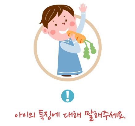 아이의 성격이나 좋아하는 것을 알려 주시면 치료 시 행동조절에 도움이 됩니다. 신체병력(심장질환, 천식, 알레르기,비염 등), 복용중인 약에 대해서도 꼭 말씀해 주세요.